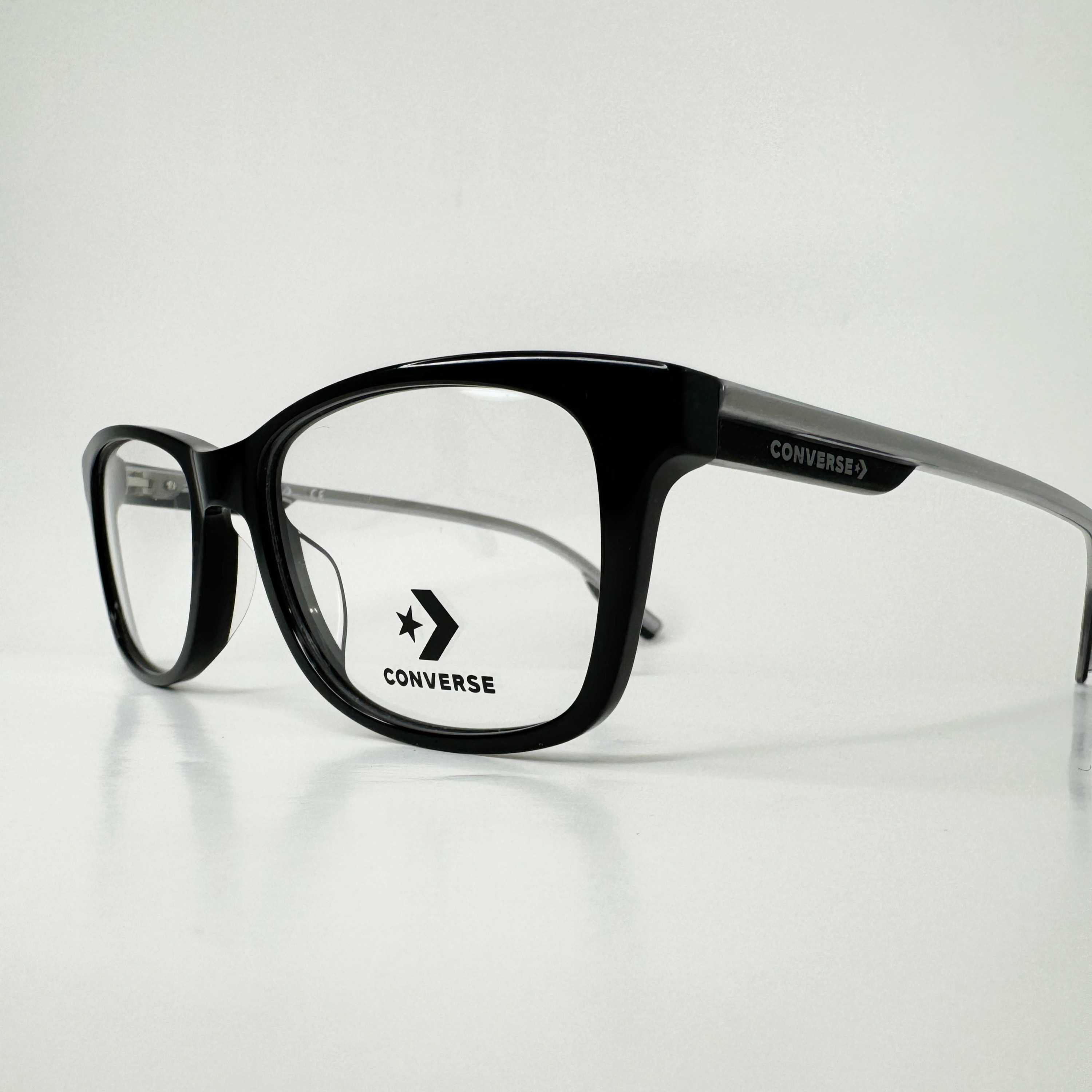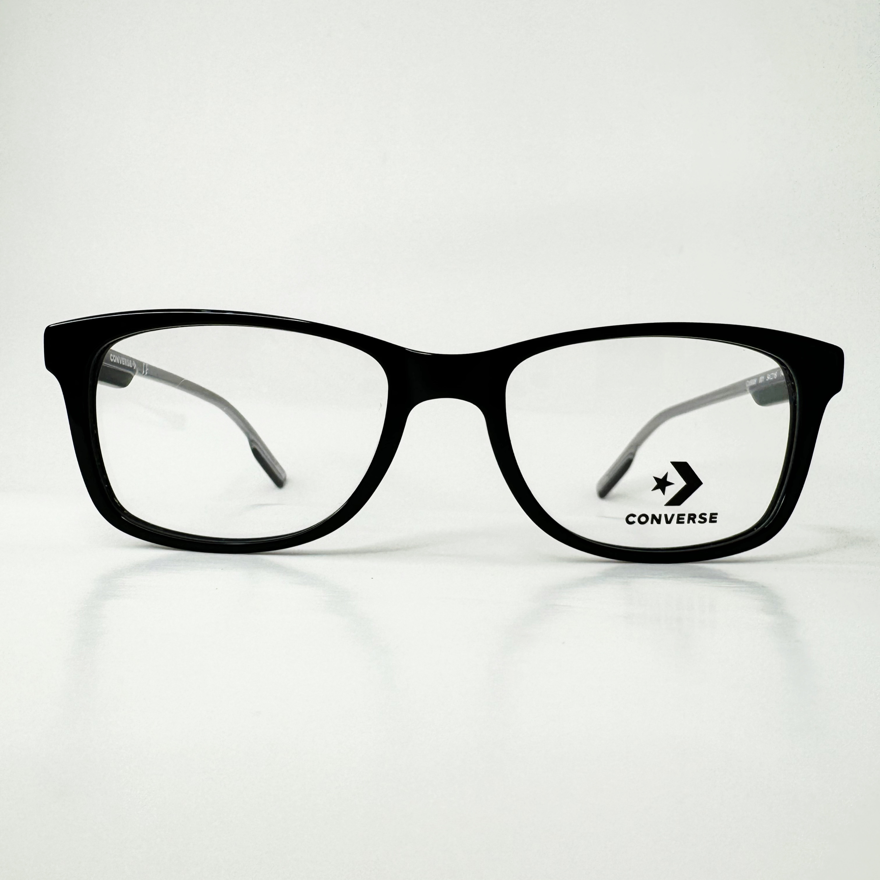 Oprawki Converse CV5006 001 to męskie okulary o prostokątnej czarnej ramce, z logo Converse na zausznikach, łączące nowoczesny design z komfortowym dopasowaniem.